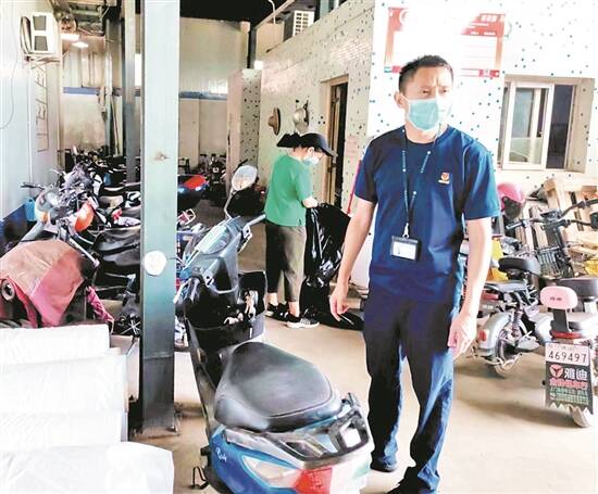 执法人员正协调企业负责人清理违规充电、停放的电动自行车