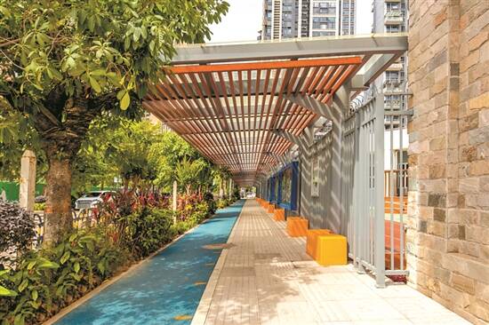 走在宝安区海旺学校附近的风雨连廊下,阳光透过半透光的廊顶,浅浅斜斜地洒落下来,在蓝白色的慢行道上投下一片光影,身边绿树摇曳,校园的青春活力气息扑面而来。在宝安区,除海旺学校外,立才实验学校、石岩公学初中部、宝安中学塘头学校等校园周边都新增了风雨连廊。