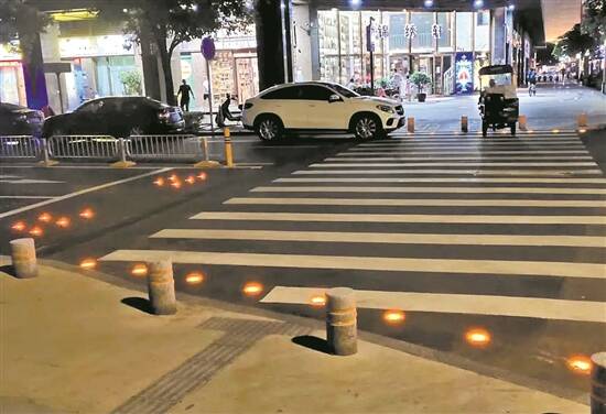 在深汕特别合作区鹅埠中学校门前,红白相间的人行横道太阳能道口标格外醒目。作为一种环保节能装置,太阳能道口标夜间直线可视距离大于1500米,识认距离大于300米。闪烁的菱形块灯可以提示道路附近有人行横道,提醒车辆减速缓行。附近的荧光黄的弹性组合标志牌,不仅可视距离大,而且其弹性结构设计保证了标志牌即使发生90°的倒伏,仍然可以自动弹回到原来状态,有效减轻人、车碰损,以及台风暴雨天气对道路交通标识牌的破坏,同时也保障了学生出行安全。此外,凸起式人行过街、智慧道钉等高科技也在学校周边落地。