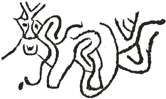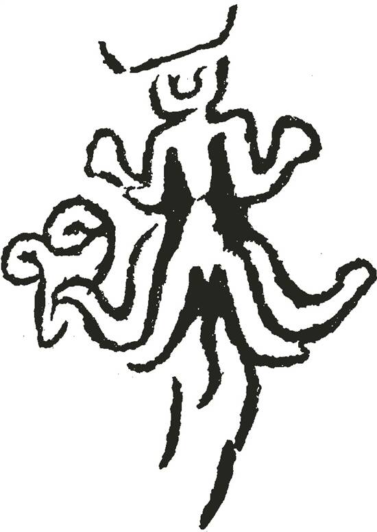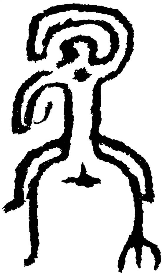 男觋: 裸身,形态两肘夹腰弯曲,两手外翻,两腿微叉,脚尖外撇。头呈方形,有眼眶,平顶,平顶右端有一线条向右上微曲,左边亦有一线条向上,略短于右边线条。