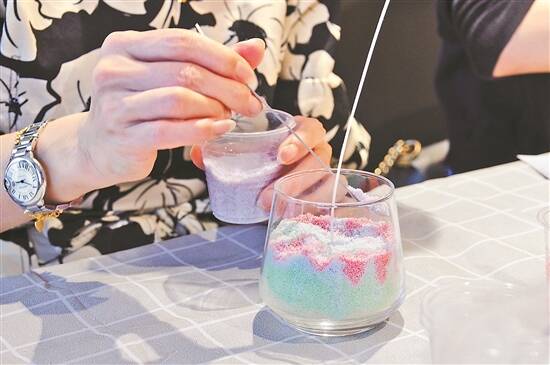 为方便学员,周末时段,郭晓莹到“又举东山”开设DIY手工创作课,来自不同年龄层、不同生活圈子的手工爱好者相聚于此,享受手工劳作带来的乐趣。这个周末,郭晓莹指导手工爱好者们制作沙画香薰蜡烛:不同的色彩分别滴在冰花蜡上,一层层铺叠,整件香薰蜡烛作品犹如精致的甜点蛋糕。王女士和女儿Berry第一次参与沙画香薰蜡烛手工体验课。“以前带着女儿参与过烘焙、编织公仔的课程,现在手工制作课多了新玩法,趣味十足。”王女士说。