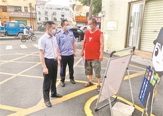 宝龙街道党工委副书记、政法委员罗飞凡(左一)检查社区小区卡口疫情防控工作