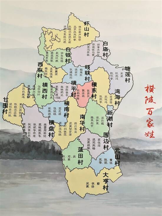 据了解,横陂镇地处恩平、台山、阳江三市交界,全镇下辖19个行政村、2个圩镇社区、199个村(居)民小组,总人口4.1万人。横陂镇虽然人口不多,但姓氏却不少,基本每条村庄居住的村民都由10多个姓氏组成,其中横盘村、虾山村竟然由26个姓氏组成。翻阅1993年出版的《横陂区志》计算,当时的横陂区(不含划分出去的洪滘镇)共有64姓。后来,从横陂划分出去的洪滘镇重新并入横陂镇,姓氏遂由64姓达到了102姓。