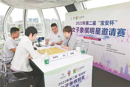 8月3日,2022年深圳市第二届“宝安杯”女子象棋明星邀请赛开幕式在深圳前海HOP国际&中鹏物业集团举行。本次赛事邀请了中国象棋协会2022年公布的最新一期中国象棋快棋等级分名单中的王琳娜、赵冠芳、陈幸琳、党国蕾、陈丽淳、时凤兰共6位女子选手参赛。比赛地点打破常规,首次设置双赛场,部分赛事在大湾区的崭新地标——全国首座全天景轿厢、高达128米的摩天轮“湾区之光”里面进行,云端对弈,落棋有声。比赛线上进行同步直播,由广东汕头籍中国象棋大师李鸿嘉现场解说。