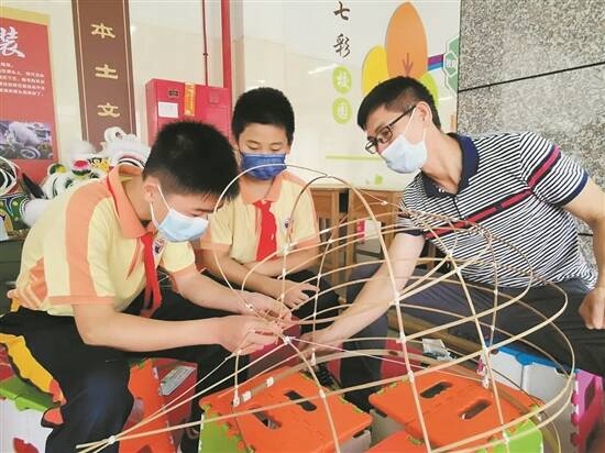 冯胜强进校园指导学生扎制狮头 张舜同 摄