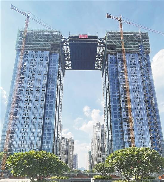 羊城晚报讯 记者张闻、通讯员黎昭映摄影报道:近日,有“南海新地标”之称的“南海之门”空中连廊实现整体提升,随着该项目的成功封顶,标志性的“门”字造型也揭开面纱,高约140米的独特门型建筑即将崛起于南海城市中轴之上。