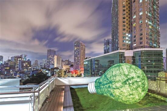 从传统走向现代,如今华安楼的天台被打造为“光伏花园”,五颜六色的花草植物在天台展现出独有的生命力,光伏发电板向大众展示前瞻能源发展的新方向。夜幕降临,一颗巨大、被绿植覆盖的灯泡装置被点亮,象征着绿色电能照耀羊城。