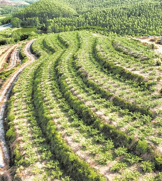 除了修剪和套袋,对土壤水分的把控也是影响番石榴味道的关键。唐灿容解释,番石榴的生长土壤若水分太多,会稀释甜度;若水分太少,会干枯萎靡。因此,当番石榴树嫩叶出现暂时萎蔫时应当浇水,当土壤出现积水时则应排水。“更合镇的土壤以沙土和黄泥为主,比较疏松,不会积水;再加上我们的种植园位于山坡上,也有利于排水。”