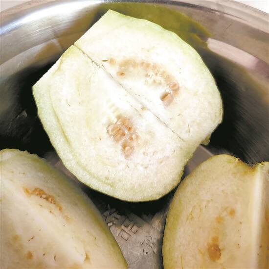 接受了充足的日晒,脱下塑料“衣裳”的番石榴依旧表面温热,果皮上的汁水让人垂涎欲滴。一口咬下去,果肉致密,入口甘甜;吃到内层果肉时,舌头又会被绵密绵软的果肉包围,番石榴特有的酯类香气充满整个口腔。