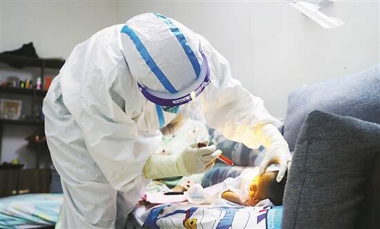 夜幕中的村子,灯光星星点点。一路上,救护车司机争分夺秒,当晚9时,医疗保障小组到达了目的地。穿上防护套具,包装好经皮黄疸仪,樊丽娥和周晓艳快步走入新生儿家中。经过现场仔细诊疗,樊丽娥判断是新生儿黄疸,随即用测黄疸仪器为新生儿测量黄疸值。