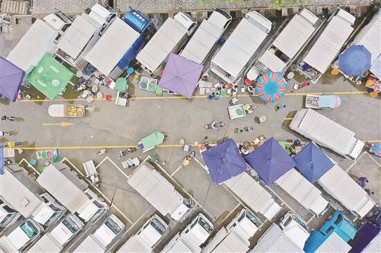 比档主和食客更早来到市场的,正是海鲜批发商们,每日晨曦刚刚破晓,货车便经过卡口驶入卸货区,随后这里一派热火朝天景象。航拍镜头下的卸货区,车辆一字排开,行人穿行其中,大家争分夺秒,做着新鲜海味“搬运工”。