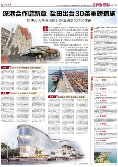 《实施方案》结合盐田实际精准发力,分为三大部分、30条重磅政策干货,明确了盐田区抢抓“双区”驱动、“双区”叠加和“双改”示范机遇,紧密对接香港北部都会区发展策略,建设沙头角深港国际旅游消费合作区的重要举措和未来发展目标。