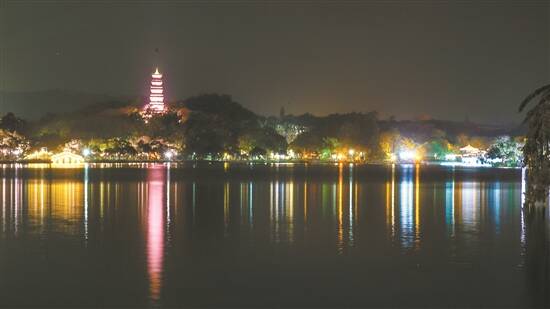 灯光下的惠州西湖,泗洲塔仍为焦点