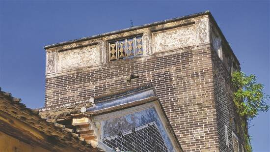 四角碉楼楼体高大,比主体建筑高出一倍,外墙为青砖砌成。楼顶融入西式建筑元素,在满足防御功能的基础上,追求建筑的形式美,成为当地的地标。四角碉楼作为防御性建筑,内置多个瞭望口、狙击口和铳眼。远远望去,外墙雄风犹在,固若金汤。虽然碉楼内木结构几乎丢失,但几乎每间房子都有枪眼,依然保存完好。