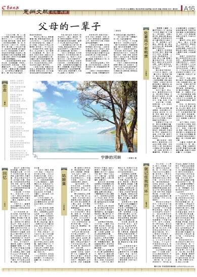 “好了,你先坐一下,我去看看刮风没?”母亲带上门出去。一晌不见母亲回来,我隔着玻璃望去,看见母亲弯着腰,不停地捡着什么。父亲有点不耐烦了:“你妈妈呢,咋还不回来?再磨磨叽叽我就不去了。”母亲应声推门进来:“走吧,走吧,有块玻璃碎了,怕你出去滑,我都捡起来扔垃圾桶里了。你呀,现在脾气比那孙猴子都大!”