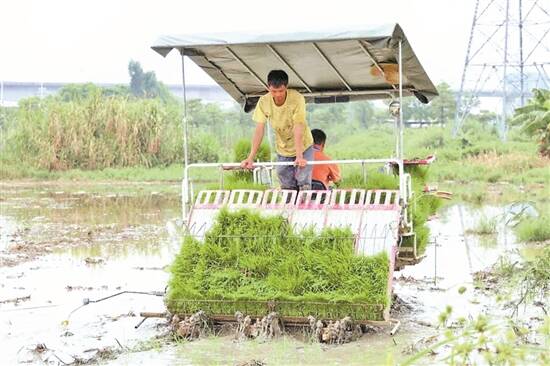 记者了解到,为不误农时,进驻该生态园的广东富舟农业科技有限公司推广全程机械化耕种,投入了两台水田平整机和三台插秧机,仅用了半个月时间就完成了水田的平整和灌溉工作。农田上,插秧机在加足马力作业,只见一人开着机器,一人在后面将秧苗放入分秧盘,插秧机下面的履带齿轮不停滚动着将秧苗播种到田里,一路过去,光秃秃的水田就种满了绿油油的秧苗,速度快效率高。