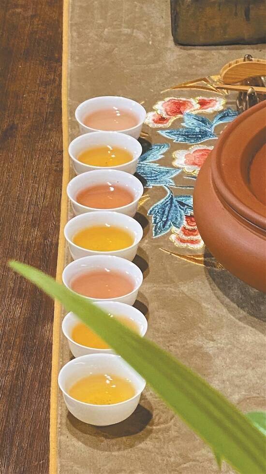 净手、茶器摆放、茶灶生火、飞泉击缶、煮泉净具、温汤清茶、热盏热罐、煮泉、投茶、候汤、扬汤止沸、三入泉、出汤、分汤、敬奉香茗、品茗、瑞气圆融……一套细致的煎茶流程完成后,案上的数盏茶杯里,尽是色泽不同的茶汤,深深浅浅,相映成趣,这正是方云帆所介绍的“一叶出七彩”。