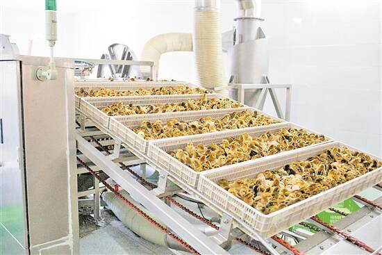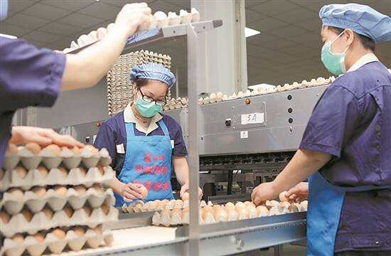 产业园的企业生产线上,工人正在放置鲜鸡蛋