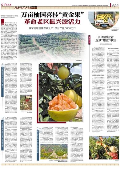 随着乡村振兴的大幕拉开,大美乡村日渐成为年轻人的“创业热土”,乡间田野焕发出新活力,各地涌现了不少“新农人”创业故事。近年来,惠州惠东北部的安墩镇依托优越的气候条件大力发展蜜柚种植产业,并逐渐打响了“安墩蜜柚”品牌。如今该镇的蜜柚种植面积已超过1万亩。2020年,3位年轻人在这座山区小镇承包了千亩柚园,扎根乡村逐梦“甜蜜”事业。