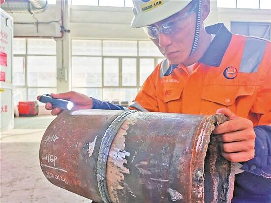 在修复滑斗整整一周的时间里,王佳鑫用碳弧气刨小心翼翼地刮开已经成型的焊缝,一层层找寻着缺陷,重新焊接时又一遍遍地清理药皮和飞溅物,确保填充金属和母材之间完美地熔合。完成后,王佳鑫忐忑不安地站在探伤检测员的旁边,看着超声波仪器上的波形。“波动非常均匀,很干净,没有缺陷!”随着检测员的评价落定,车间里充满了修复成功的喜悦。