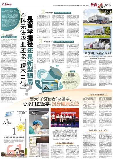 在暨南大学里,有这样一位“爱牙志愿者服务队”成员,她穿行于校园、社区和村镇义诊,普及口腔卫生知识,消除人们对口腔的误解;她参与“八零二零”儿童口腔健康公益教育计划,做视频、写文章、画漫画,推进儿童口腔健康教育。她是暨南大学2018级口腔医学专业本科生、2021年暨南大学博雅卓越医学生奖学金获得者赵茗宇,医学世家出生的她立志成为“护牙使者”。