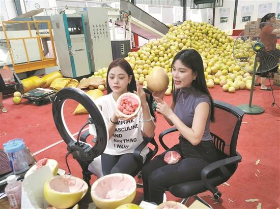 “大家下午好,欢迎各位网友来到柚见丘香直播间……”在位于大埔县的梅州万川千红农业发展有限公司的仓库里,几名工作人员正在进行网络直播销售蜜柚。“我们有各种规格的包装,目前四个装的蜜柚销量很高。”该公司负责人丘牡香表示,眼下蜜柚迎来销售旺季,除了线下销售,该公司每天通过网络销售十几万斤蜜柚。