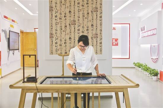 在智慧阅读体验区内的智能书法台,有读者正运笔练字。据了解,智能书法台采用以水代墨技术,通过检测运笔之角度、力度和速度,结合4K高清触摸大屏,完美还原书法写作效果。