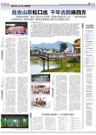 梅县松口客家山歌年代久远,同山歌一同流传的还有相关的山歌故事,其中“山歌妹”选郎的故事脍炙人口、流传甚广。
