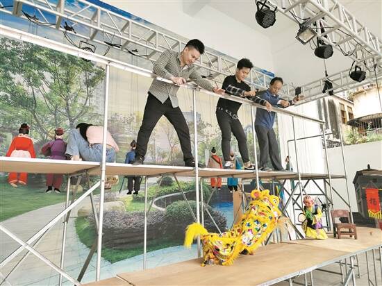 在五华提线木偶传习所,记者看到周鹏润时,他正站在新搭建的舞台上排演新戏。只见他跟搭档配合默契,指尖飞舞,线端一只金黄色的木偶狮子做出的动作维妙维肖。