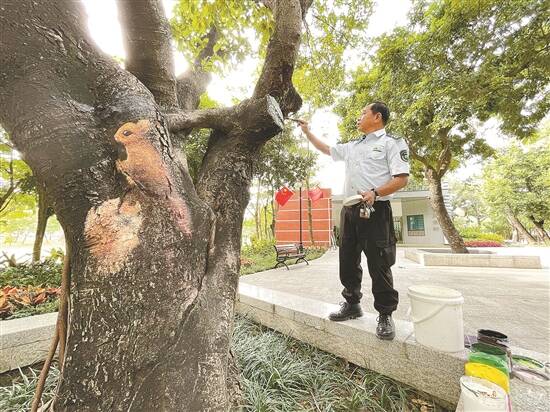 电箱上的梅花鹿,树干上的小松鼠,水井盖上的小白兔……这些画作都出自深圳公园管理中心的保安李平之手,绿树掩映之间,他的创作为游客们平添一份游玩的趣味。漫步在公园,游客与微小的幸福不期而遇。