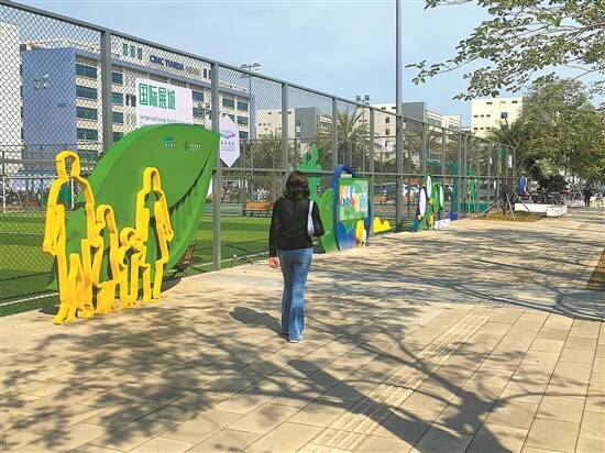 健康长廊位于重庆路地铁20号线国展南站A出口。展城社区在原有社区文体口袋公园、足球场、篮球场的基础上,选用色彩明亮的街头小品装扮长约500米的道路,让走出地铁口的行人及周边企业员工、居民眼前一亮。