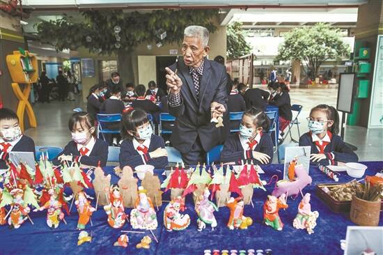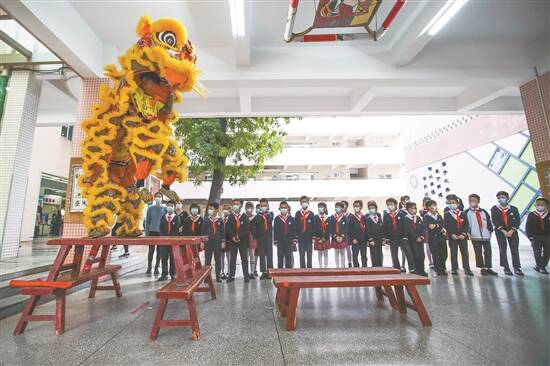 活动现场,学生们或是笑逐颜开围着醒狮头,或是专心致志为茶山公仔上色,或是聚精会神体验龙舟制作技艺、学习咏春拳……非遗的种子在孩子们心中悄然种下,并在不经意间生根发芽。