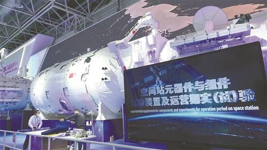 在第十四届中国航展上,航天科技展台旁人头攒动,观众们争先一睹“天宫”的真容。今年恰逢中国载人航天工程立项实施30周年,中国航天科技集团带来了本届航展上的重磅展品——1∶1空间站组合体展示舱,全景展示空间站T字基本构型,让“天上宫阙”与“南海明珠”交相璀璨。