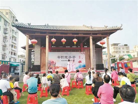 第二天下午4点,“粤韵竞芬芳”非遗粤剧演出也在迳口举行,演员们倾情演绎了经典粤剧曲目《梦会太湖》《丽影》《牡丹亭》《花好月圆》等。演员流畅明快的唱腔、精湛的演技、极具感染力的表演赢得了在场观众的热烈掌声。