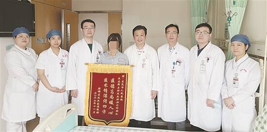 面对这一难题,王在国艺高胆大,凭着扎实的解剖功底和精准的术中操作,约4小时就顺利地切除了左半肝、右前叶及肝门淋巴结,同时完成了右肝两个转移病变的术中微波消融。术后第十三天,梁女士就康复出院,家属送来了一面写着 “医德高尚暖人心,医术精湛传四方”的锦旗。
