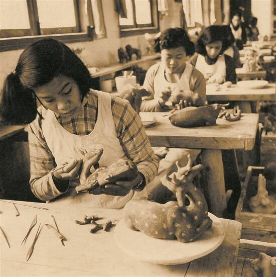1959年,霍兰(前一)、陈杏松(第二排)在制作陶塑动物