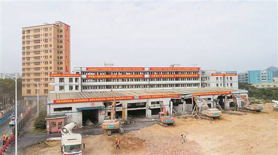 清拆主会场上钩机、洒水机同步作业,对上村莲塘工业区几处厂房进行拆除