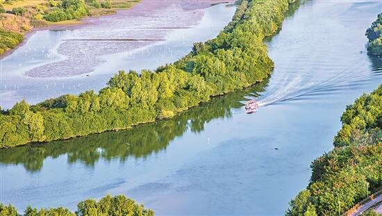在绿道的中段,红树林湿地公园内,白色的鹭鸟时而展翅掠过红树林顶端,时而踏着湿地、低头觅食。