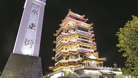 行走在水东街上,映入眼帘的是一座约5米高的方形尖顶石柱,刻着“水东街”三字。两排崭新的仿古建筑,灰白相间,房屋整齐一致,设置了众多新潮打卡点,现代商业氛围浓厚,青砖灰瓦掩映着灯红酒绿,吸引着年轻人。白天,这里延绵的骑楼建筑令人眼花缭乱。夜幕降临,水东街则披上霓虹“外衣”,流光溢彩。