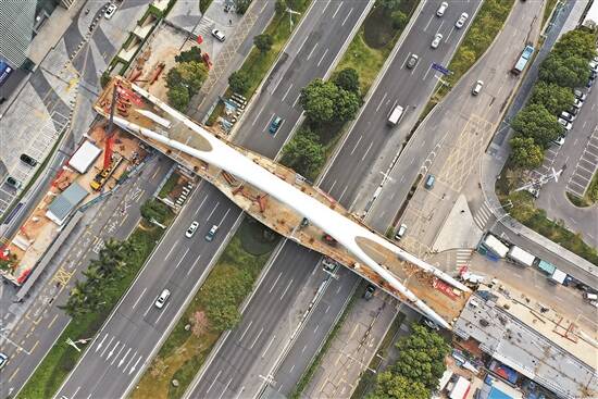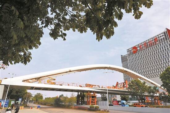 如今,途经东莞市民服务中心东门一侧,一眼就能看到一座人行天桥——2号桥横跨东莞大道之上,将市民服务中心和民盈国贸中心连成一体。记者昨日实地走访获悉,作为东莞市中心区核心地段立体慢行系统的重要组成部分,2号桥又称“连心之桥”,是跨东莞大道第一人行桥。主桥梁经过15天共500多次的顶推,主拱桥“走”了153米后顺利跨过东莞大道。目前主体结构施工已进入收尾阶段,预计2023年年中完工。