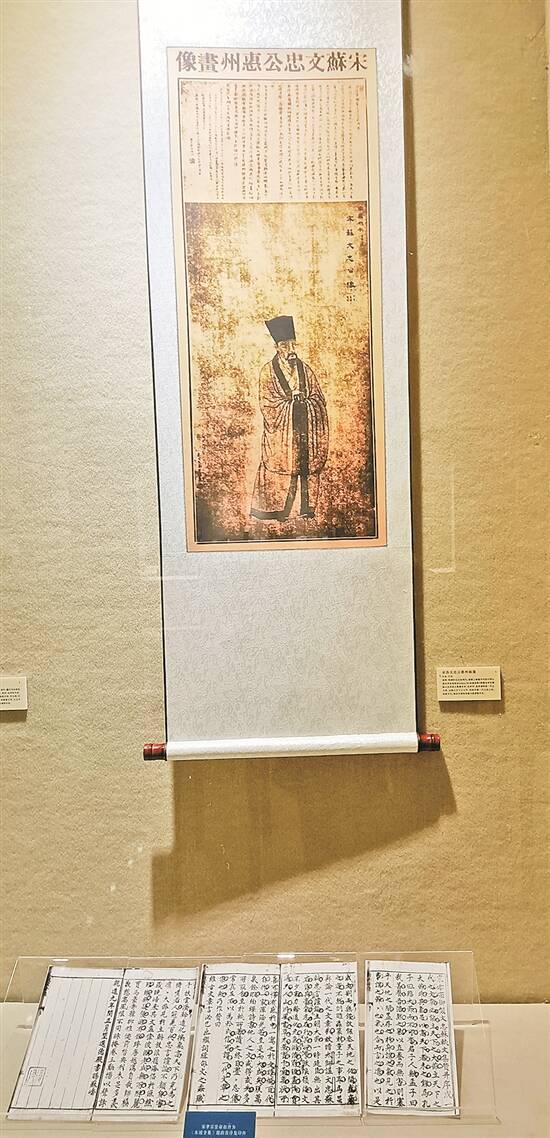 这件作品曾著录于2016年由广东人民出版社出版的《惠州近代历史图录》,该图录由惠州本地有一定影响的专家学者编撰。对该画像,编著者表示,宋苏文忠公惠州画像拍摄于1926年,悬挂于白鹤峰东坡祠内。但画作起于何时?又是谁画的?目前尚待进一步考证。在惠州市博物馆藏东坡文献史料特展中,博物馆按比例将原画像高清影印制作成一件画心高约90厘米、宽约37厘米的仿古宣纸挂轴,画面内容整体分上中下三段,最上面为正楷大书繁体“宋苏文忠公惠州画像”九字,中部为一段题字,计700余字,字迹已模糊不清,下部分为东坡画像,画像右上角所题写的“宋苏文忠公像”这六字仍清晰可见。笔者对于中间一段题字内容极感兴趣,后邀文史学者专门认真勘对,经过仔细解读,确认其中一段文字是宋孝宗皇帝赵昚为《东坡集》所题的首序内容。该序书于乾道九年(公元1173年),此时东坡逝世已有60多年,赵昚在序中言:“成一代之文章,必能立天下之大节。立天下之大节,非其气足以高天下者,未之能焉。……雄视百代,自作一家,浑涵光芒。”孝宗亲读苏文、亲赐谥号文忠公,又赐太师官阶,亲封其孙高官,把曾作的《御制文忠苏轼文集赞并序》赐予苏轼曾孙苏峤。从宋孝宗为《苏东坡集》亲自作序可见,他对东坡及其文学艺术成就的高度赞誉。在博物馆一楼正在开展的东坡文献史料特展中,策展人在宋苏文忠公惠州画像下,同步展出宋孝宗皇帝给《东坡集》所书的这些序言复印件,全文展示,还原东坡画像上的其中一段题字内容,信息量大,可读性强。
