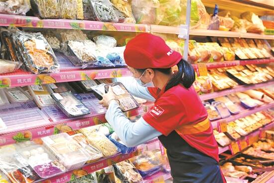 钱大妈门店工作人员正在上架生鲜食材