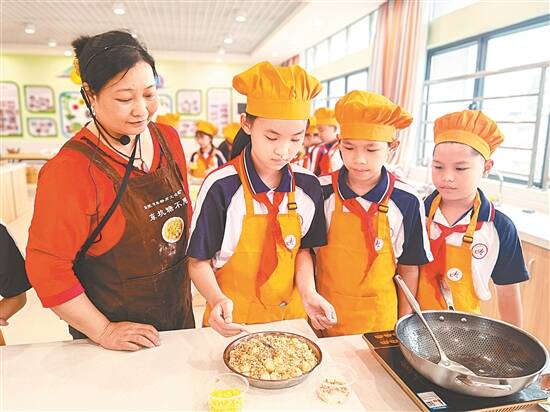 劳动课上,学生跟着老师学做糖不甩(资料图)