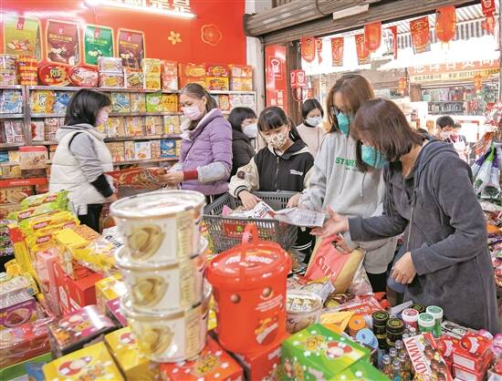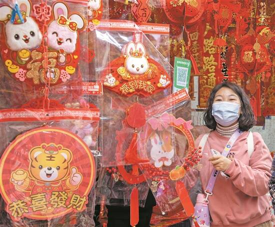 作为癸卯年的主角,“小兔子”元素的春节装饰品深受市民喜爱。在老街各商铺,印着“前兔无量”“大展宏兔”的利是封、毛茸茸的兔福字以及兔子卡通形象的玩具备受追捧。
