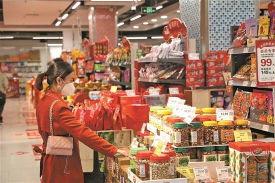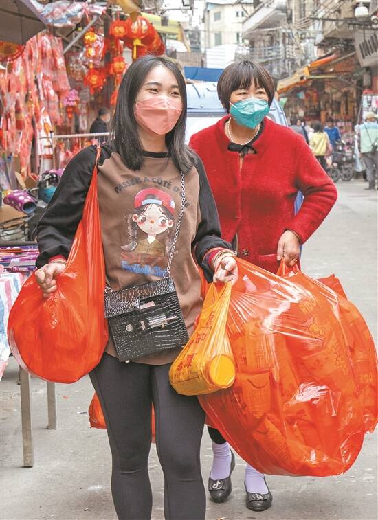 除了此起彼伏的叫卖声、讨价声,老街上还响起悦耳的贺年歌曲声,人来人往,好不热闹。不少街坊“全家总动员”来“扫货”,提着大包小包心满意足地回家。