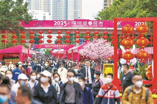 千米长街春意盎然,各色鲜花争奇斗艳,国风汉服舞蹈表演、新春吉祥物巡游热闹非凡,一场全民同乐、时尚浪漫的花市嘉年华在鹏城大地绽放。1月17日,2023深圳迎春花市开展进入第3天,随着农历春节的临近,越来越多的市民走进花市主会场、分会场,在鲜花绿植布置的长街购花拍照、看展览、品美食,尽情感受浓浓年味。今年的迎春花市,承载着深圳人春节记忆的爱国路花市重启,更是为鹏城新年增添一份熟悉的年味。