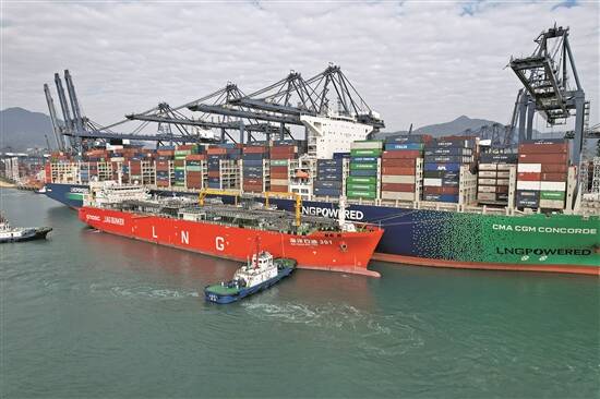 羊城晚报讯 记者林园报道:1月18日,全球最大LNG运输加注船“海油石油301”在全球最大单一码头盐田港通过“船对船”成功为全球最大型的双燃料动力集装箱船“达飞协和号”加注6000立方米LNG燃料。这标志着盐田区承接地综合改革首批授权清单事项——赋予深圳国际航行船舶保税燃油加注许可权已全面落地,将进一步全面推进盐田区全球海洋中心城市核心区建设。