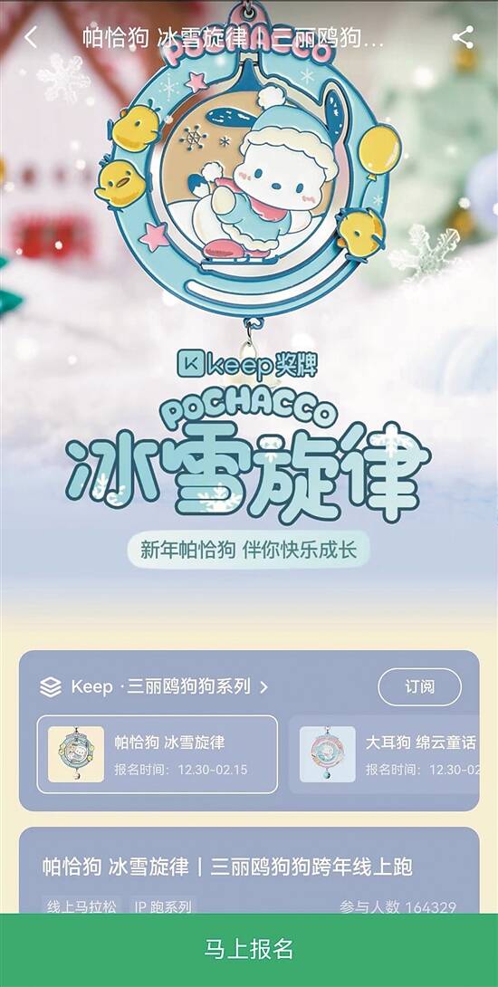 打开Keep,点击顶部的“活动”按钮,就进入了奖牌比赛页面。记者随机选择了一款名为“帕恰狗”跨年线上跑的热门赛事,显示目前已有超16万人参加,报名时间是去年的12月30日至今年的2月15日,点击进入后,大幅帕恰狗奖牌图片几乎占去了屏幕的三分之二,底部绿色的“马上报名”按钮显得格外醒目。