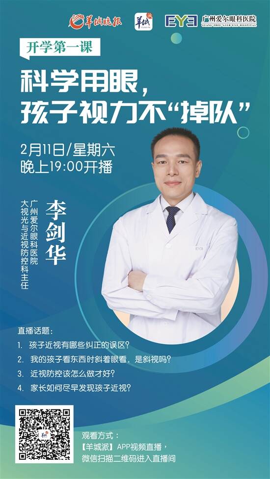为了让大家真正掌握科学的近视防控方法,李剑华主任将做客羊城派直播间,用“面对面”的方式,结合十多年的从医经验,针对“孩子近视纠正的误区有哪些”“家长如何能及早发现孩子近视”等话题进行科普,解答家长们的疑惑。