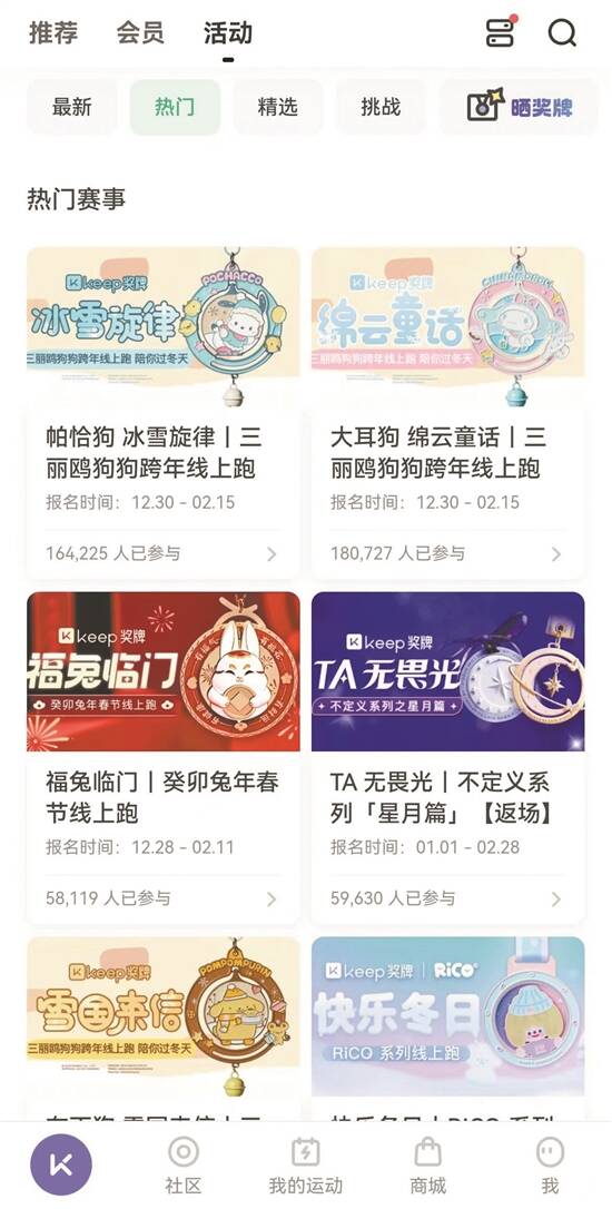 对于Keep而言,奖牌比赛确实是一门好生意。尽管“卖奖牌就卖了5个亿”的说法目前尚难直接验证,但也可见Keep对这一项目的期待。在招股书中,Keep奖牌活动被归为“虚拟体育赛事和知名IP合作创意主题活动”,并称“有助于提高会员渗透率及订阅会员的消费额”。成功案例包括:Keep与某著名国际卡通IP合作,于2021年10月至2022年5月推出三期在线主题跑步活动,参与活动的付费用户人数超过110万人,活动登记费产生的商品交易总量超过5000万元;于2022年3月至5月推出另一期在线主题跑步活动。参与活动的付费用户人数超过70万人,而活动登记费产生的商品交易总量超过4000万元。